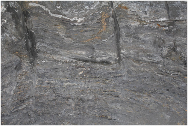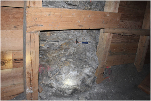 The bulk sampling program incorporated a 2.7 x 2.7m drift driven for 34m to a vertical depth of 34m (near horizontal length of 34m) with chip-channel samples collected along the ribs at 1.5m intervals. Results from the sampling have confirmed that high-grade gold mineralization is associated with subparallel quartz and calcite veins and veinlets within foliation and bedding (Figures 1 and 2). The mineralization appears to be stratabound and is hosted within sheared metamorphosed interbedded limestones, argillites and phyllites of late Cambrian age. This mode of occurrence of mineralization appears to show significant potential.