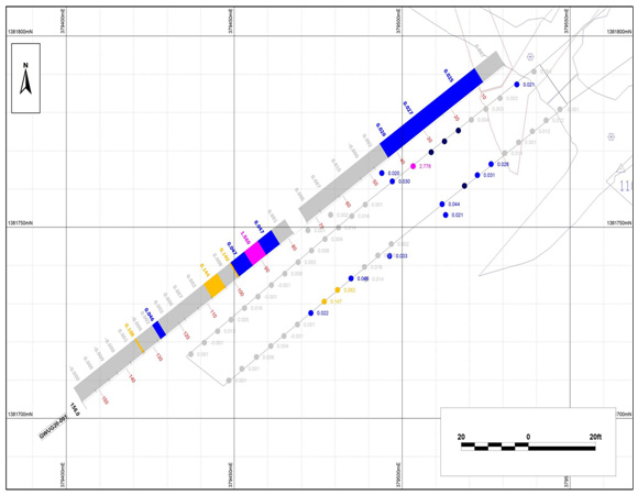 | SampleNo. | From (ft) | To (ft) | Width (ft) | From (m) | To (m) | Width (m) | Gold (oz/t) | Gold (g/t) |