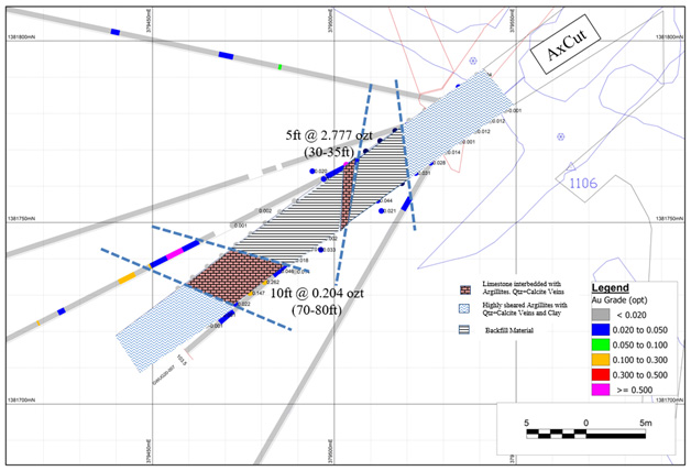 Figure 2. Mineralized zone from 9.2 to 10.7m graded 86.81 g/t over 1.5m (sample 114326)