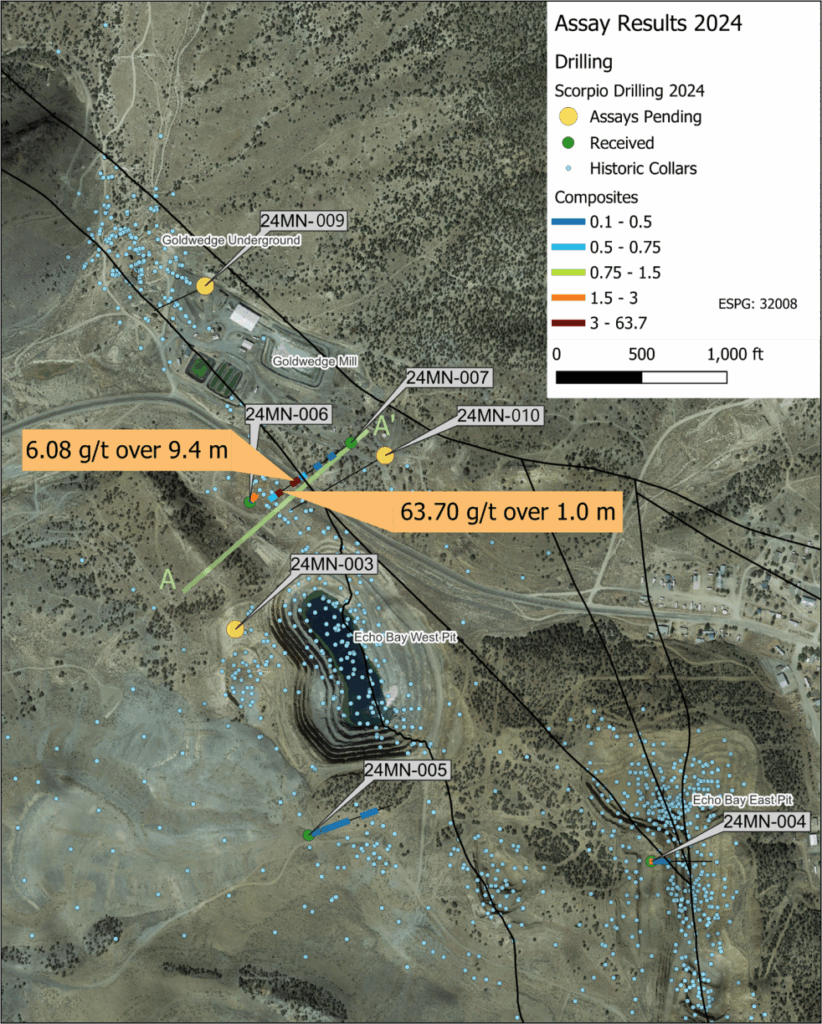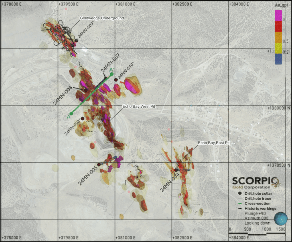 Drill hole 24MN-007 is an along strike follow up to MWRC22-018, which intercepted 4.90 g/t over 22.9 m, including 38.76 g/t over 1.5 m, and 5.19 g/t over 9.2 m, including 20.17 g/t over 1.5 m (see Scorpio Gold news release dated October 6, 2022). The hole targeted the Manhattan and Reliance Faults along the projected Goldwedge Underground Stope (“Goldwedge”) trend and further increases the likelihood of expansion of the Echo Bay West Pit (“West Pit”) mineralization towards Goldwedge (see Figure 2).
