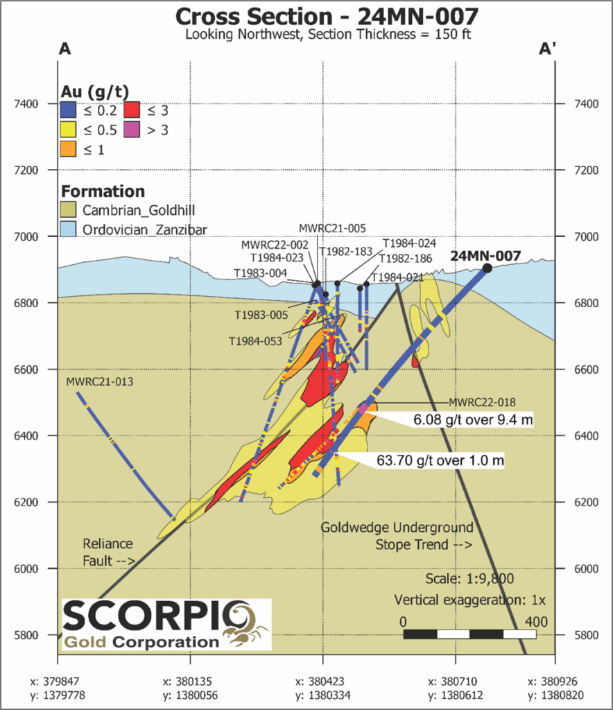 Drill hole 24MN-006 targeted a down-dip extension of the Goldwedge trend, aiming to extend high-grade mineralization along the Reliance Fault. Significant results include 5.50 g/t over 1.5 m, 2.78 g/t over 4.4 m, including 5.33 g/t over 2.2 m (see Table 1). These mineralized intervals correlate to and expand mineralization noted in down-dip drill holes MWRC21-014 (see Scorpio Gold news release dated January 4, 2022) and MWRC22-001 (see Scorpio Gold news release dated May 12, 2022).