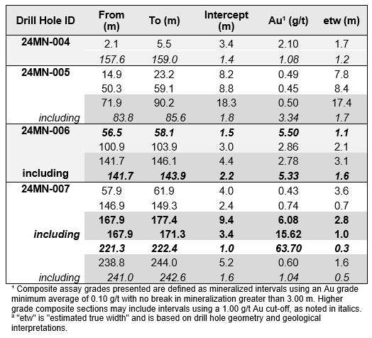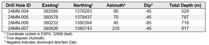 – Holes 24MN-004, 005, 006, and 007 delineate and extend historically drilled mineralization (Figure 2).